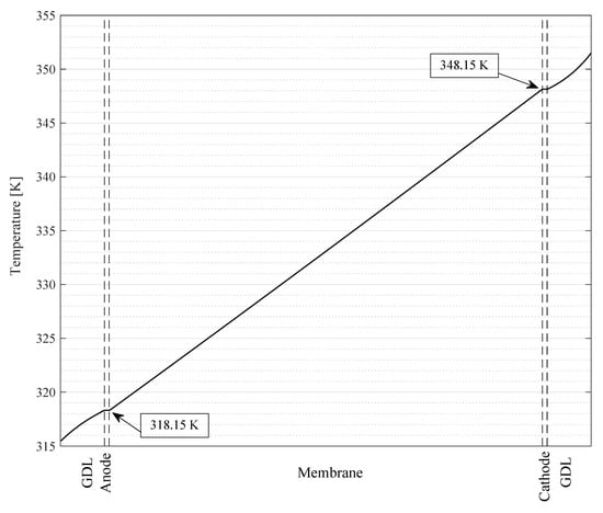 According to Equation (6), the Nernst equation of the TGC needs knowledge of the gas composition and temperature at the membrane surface to determine the phenomenological coefficients. Since the implemented sensors only supply information on the gas composition at the inlet and temperatures in the flow field, a method to calculate these values at the membrane surface is required. For this reason, the model of a previous study [23] is adjusted so that the requested conditions at the membrane are inserted and the required conditions at the cell inlet are then calculated in order to be adjusted at the setup. The thermophysical fluid properties needed in the model are calculated using NIST REFPROP 10.0 [31] with default reference state. The model considers the heat and water transport through the membrane but neglects the gas crossover and uses classical transport coefficients as an approach for the phenomenological coefficients, leading to uncertainty in the regulated conditions at the membrane. A generic temperature profile calculated by the adjusted model is shown in Figure 6.
