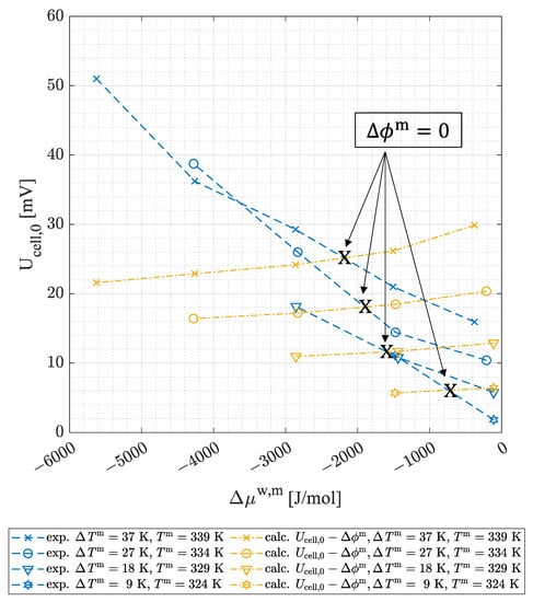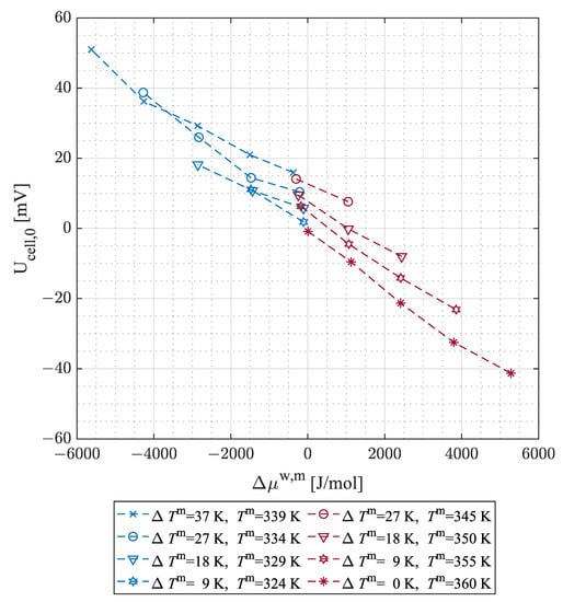 Figure 9 presents the values of OCV and OCV* for negative differences in the chemical potential of the water between anode and cathode, meaning that this gradient is now counteracting the gradient in the electrode temperatures. For slightly negative close to the values of OCV exceed the ones of OCV*, leading to a negative value of and therefore showing a similar behavior as for positive . As the is negative, either the value of Equation (15) needs to exceed the one of Equation (16), which is only possible if according to Table 1, or the phenomenological coefficients must have a negative sign to fulfill this condition.