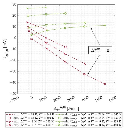 The values of the calculated OCV* corresponding to the measured OCV, as presented in Figure 7, are presented in Figure 8 for and in Figure 9 for . By comparing the data of the measured OCV and calculated OCV*, the significant impact of the difference in the electrical potential across the membrane (gap between OCV and OCV* in the plot) is evident and intensifies with an increasing difference in the chemical potential of the water. While the measured OCV decreases for all temperature variations with a change in the difference in chemical potential of the water from negative () to positive values (), the calculated OCV* shows an inverse dependence. The latter effect results from the rising difference in the chemical potential of the hydrogen between the anodic and cathodic electrodes, directly controlling the OCV*. Figure 8 shows the results of positive values of which implies a higher cathodic value of the chemical potential of the water than the one at the anode. That means the gradient of temperature and chemical potential of the water appeal in the same direction. The values of the OCV are uniformly below the corresponding OCV*, which implies a negative value of according to the Nernst equation (Equation (6)) for all data points. Since as well as are positive values, and with the knowledge of positive as discussed in a later section of this paper (see Figure 10), one can assume positive values for and in the considered scope of the chemical potential of water and temperatures. In the absence of gradients in temperature and chemical potential of the water over the membrane, the OCV is expected to be zero as well (see Equation (6)). Taking a look at this equilibrium condition shown in Figure 8, one can see an OCV slightly deviating from zero (). This inconsistency could be explained by a small variance in the positions of the thermoelements implemented in the flow field (see Figure 4), of which the temperature is used as the controlled variable for the electrode temperatures. As a result, a slight temperature gradient across the membrane could occur, although the measured gradient is zero. Due to the dependency of the chemical potential of the water on the temperature, the impact on the OCV could be even higher.