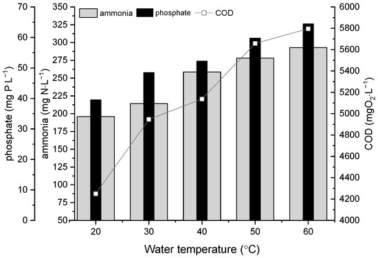 With increasing temperature of water extraction, increasing amount of ammonium in LP-CM (liquid-phase chicken manure) was observed, from 196 mg NH4-N/L to 295 mg NH4-N/L, which is connected with increasing compounds solubility depending on temperature. For extraction at 50 °C and 60 °C, 42% and 50% more ammonium was extracted, respectively, compared to 20 °C. The increase of extraction temperature from 20 °C to 60 °C led to the growth of the phosphate content in the liquid phase from 32% to 63% (Figure 1).