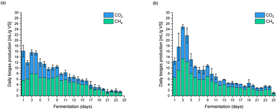 In the case of fermentation of all samples, slight process breakdowns can be observed, manifested by a decrease in methane concentration in the biogas, falling between the fourth and eighth fermentation day.