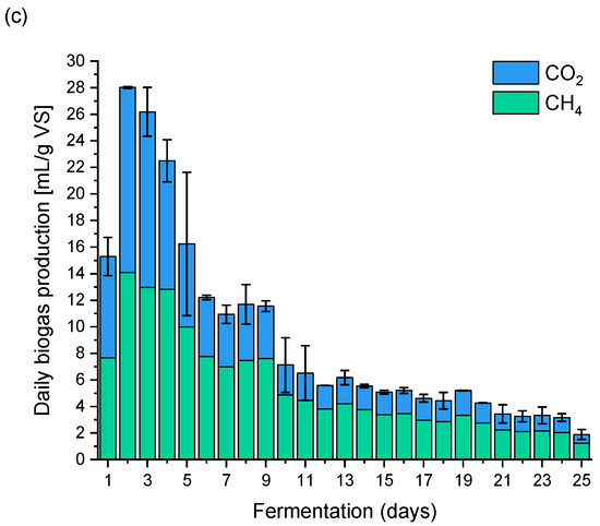 Regardless of the extraction temperature used, the dynamics of the fermentation processes were similar. During the SFCW fermentation, clear peaks of biogas production were observed, with the most intense peaks being on the third day of the process, and several smaller peaks in the second and third week of fermentation (9th, 13th and 19th days). As previously mentioned, the dynamics of the fermentation after the treatment of Figure 2c) was similar because clear biogas production peaks were also observed in the first week of the process on (2nd, 3rd and 4th days) and less intense in the second week and at the end of the experiment (8th, 9th and 19th day).