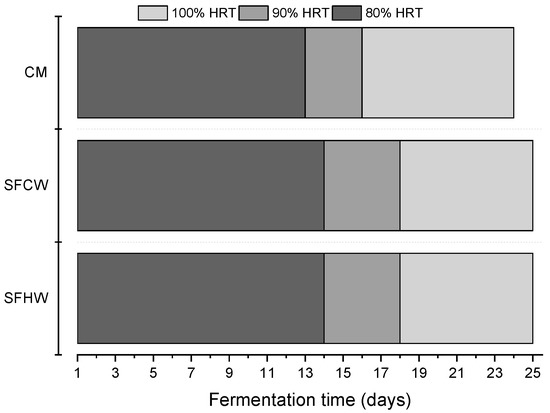 On the basis of the VDI (Association of German Engineers) guidelines, batches contained 10.14 g VS/L of CM, 9.55 g VS/L of SFCW (solid fraction after cold water extraction) and 9.46 g VS/L of SFHW (solid fraction after hot water extraction).