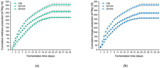 Figure 4 shows cumulative biogas and methane efficiency per ton (Mg) of organic dry matter. The largest biogas production was observed for SFHW (527.8 m3); for SFCW it was 420.6 m3 and for CM about 45% less than for SFHW (362.5 m3). An increase in biogas yield was observed of 16% and 45% for SFCW and SFHW, respectively. Obtained results are consistent with those presented by Böjti et al., where differences in gas production before and after water extraction from CM were recorded according to VDI methodology [68]. Lisboa and Lansing [62] and Li et al. [60] obtained similar amount of gases for chicken manure on a VS basis.