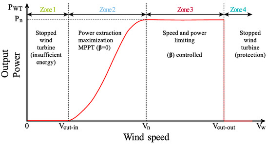 In response to how fast the wind is blowing, the turbine can work in two different modes: nominal power and maximum power point tracking (MPPT). As demonstrated in Figure 1, when the speed of the wind lies between the nominal speed and the cut-in speed, the turbine will work in MPPT mode, which requires the highest power conversion coefficient . When the speed of wind falls under the predetermined cut-in speed, the wind turbine ceases its operation due to insufficient energy to initiate rotor movement. Similarly, if the speed of wind goes beyond the designated nominal threshold, the wind turbine shuts down as a precautionary measure to prevent any potential damage to the blades [25].