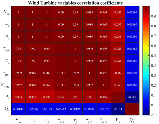 Initially, a correlation analysis of the system data is performed according to [31]. Thus, the correlation coefficient matrix of the wind turbine data was obtained with variables, respectively. This analysis indicates that the variables that most interrelated with , which is the variable of interest, are those with a Pearson’s correlation coefficient of . Figure 2 depicts the matrix of correlation coefficients of the wind turbine data.