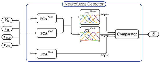 The neurofuzzy detector uses the input variables shown in Figure 3, which are the result of the analysis presented previously: wind speed , generator torque , aerogenerator torque , and electromagnetic torque .
