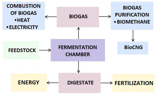 Biogas production is an incredibly prospective technology. Simultaneously, gaseous fuel and digestate are obtained using organic waste, which can be used in numerous ways. The most efficient biogas production process is co-fermentation, during which various components necessary for methane production are provided and, thus, a larger quantity of biogas with a higher methane content is obtained [34]. Biogas contains large amounts of carbon dioxide and small amounts of other gases. A complex gas is hydrogen sulphide, which is present in very small amounts. It has proved to be an extremely corrosive agent in a humid environment [35]. However, redundant gases (such as CO2, H2S, and N2) can be removed from biogas, resulting in biomethane with a methane content of up to 99.9%. Biomethane can produce Bio-CNG, be pumped into the gas network or be used as a reburning fuel [36]. Another product from digestate can also be used in other applications, e.g., as fertilizer, soil amendment or biofuel.