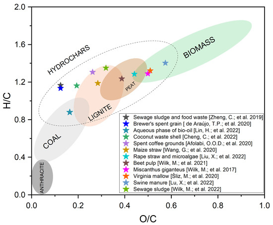 Van Krevelen diagram for hydrochars obtained of different feedstock [85,86,87,88,89,90,91,92,93,94,95,96].