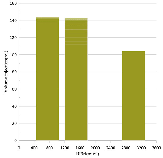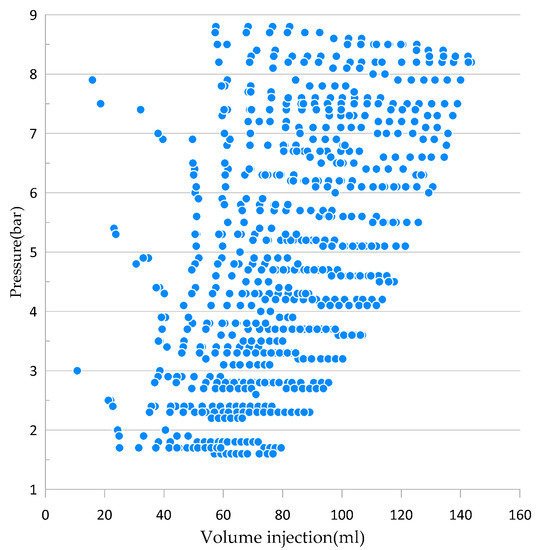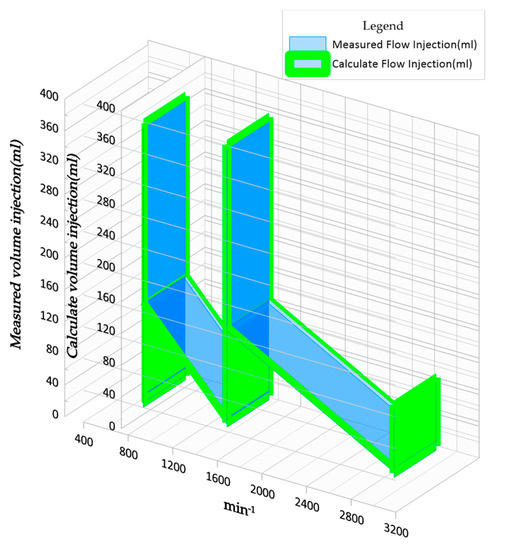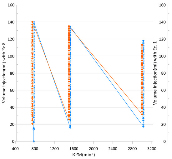 Figure 13 shows the behavior of the injection volumes calculated using two different models. On the one hand, the model of Equation (8) is used, and on the other hand, the correlation model presented in Equation (1) is used.