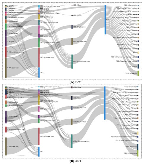 First of all, we constructed Sankey diagrams, which allowed us to visualize the changes in the EU’s electric power sector in 1995–2021 (Figure 1) and served as the starting point for a further study to explain their causes.