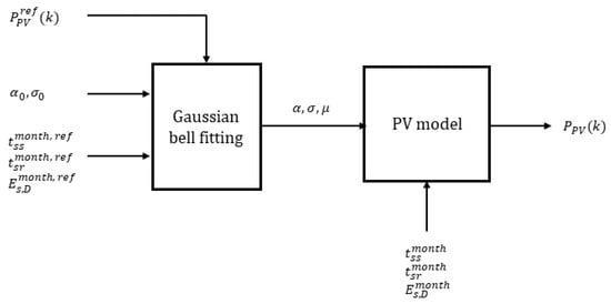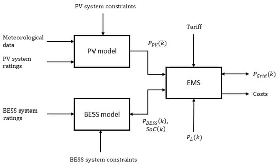 Block diagram of the PV–BESS model, considering the parameters for each instant k.