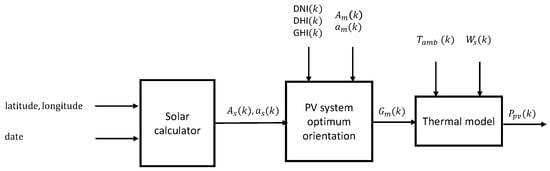 This model consists of three main parts: the solar calculator, PV system optimum orientation block for a specific objective (e.g., maximizing annual yield, yield during winter, or production during peak demand hours), and the thermal model. The inputs for the solar calculator are the location (latitude and longitude) of the PV system and the time frame where the analysis will be performed (date), as shown in Figure 2. Based on that, and following the procedure reported in [26], it is possible to express the position of the sun in terms of altitude () and azimuth (). These two coordinates are calculated every time step k and are the PV system optimum orientation block inputs. This block also takes annual irradiance information to estimate the total irradiance over a PV module () for a specific orientation, i.e., azimuth () and inclination of the module (). Note that the values of and are changed to find the combination that yields the maximum energy (in kWh/m2) over a year. This way, it is possible to study modules not optimally oriented due to installation constraints such as roof orientation.