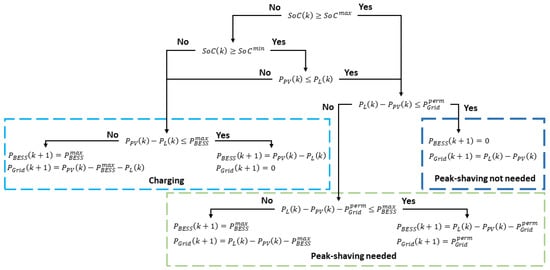 The flowchart in Figure 4 depicts the general control scheme. Note that both applications will follow the same logic, governed by two constraints: the state-of-charge of the battery and the permitted power from the grid, . The main difference is that the self-consumption will have a permitted power from the grid of 0 kW, whereas the peak-shaving will have a permitted power above 0 kW.