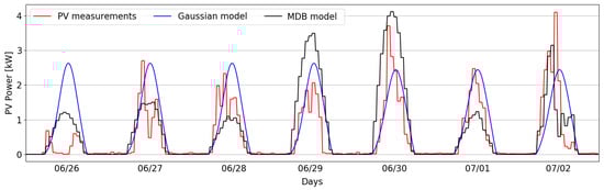 Figure 6 shows a representative week from the simulated year, considering simulation parameters indicated in Table 3. As can be seen, the Gaussian model considers a uniform curve throughout the month. As it does not consider cloudiness, its accuracy for real-time predictions is very low, as on June 26. Still, it can perform relatively well on sunny days, as on July 1. On the other hand, the meteorological data-based model depends on weather conditions. This way, it can recreate sudden changes in power due to meteorological conditions, as on July 2. We must highlight that the results of the meteorological data-based model do not coincide with the real-time variations because we used historical data. However, the MDB includes the seasonal effects on PV generation from an energy and power perspective.