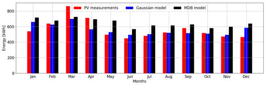 As tools for preliminary assessment of monthly PV generation, the models showed an acceptable accuracy, as detailed in Figure 7. For this purpose, the Gaussian model performed better, with a monthly error ranging from −20.7% and 25.3%, with an average of 1.456%. The MDB model, on the other hand, had a monthly error ranging from −15.8% and 37.18%, with an average of 17.74% (the error was considered as the difference between the total accumulated energy resulting from the measurements and each model, divided by the total accumulated energy from the measurements). The reason behind this behavior is similar to the analysis of the real-time comparison presented above. Since the Gaussian model is based on monthly values gathered from PV power measurements from previous years, the representative behavior of more extended periods (such as months) performs better than short periods (such as specific days). Similarly, it is less sensitive than the MDB model, which depends on meteorological data that vary yearly.