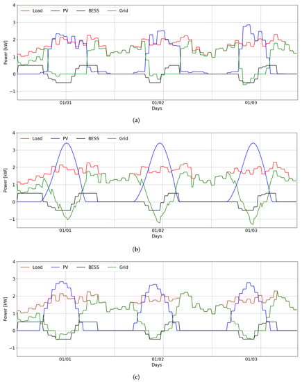 To validate the performance of the models under self-consumption schemes, we defined a permitted purchase power of 0 W (). This way, the algorithm will always prioritize supplying the demand from the BESS. Figure 8 shows a representative section of the simulated year. As expected, the BESS cannot supply the load entirely in the absence of PV availability, as the power demand is higher than the capacity of the BESS inverter. Thus, power is purchased from the grid. Similarly, when the available PV power surpasses the load, the BESS is charged, constrained by the inverter’s nominal capacity, returning the excess to the grid.