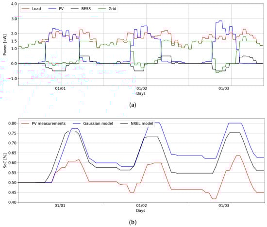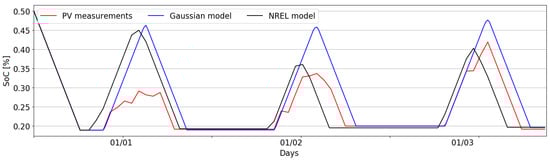 Complementary to the power exchange shown in Figure 8, the behavior of the SoC of the BESS is shown in Figure 9 for the measured PV power and the two models. One can notice that the SoC curves overlap at the beginning until the PV power becomes available. Given the uniformity of the Gaussian model, the charge and discharge behavior is consistent between days. For the MDB model, the effects of the meteorological conditions are present when the PV power drops below the load near sunset. The power used to charge the BESS drops for short periods, usually during the evening.