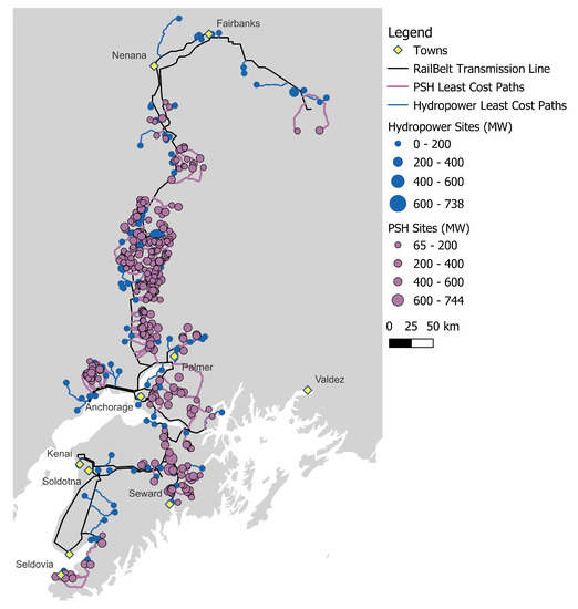 For conventional hydropower, a database from the Alaska Energy Authority distributed through the State of Alaska Open Data Geoportal [21] was used to map proposed hydroelectric sites in Alaska. For PSH, datasets from the National Renewable Energy Laboratory (NREL) were used [22]. This dataset was created using a GIS-based analysis of potential closed-loop systems in the United States. The PSH sites were filtered in an assessment performed by NREL [22,23], and the number of sites was narrowed down to 1819 sites. The goal of the generated resource maps was to estimate the possible size and number of PSH and hydro resources potentially usable for the Railbelt. The following criteria were used to select sites: