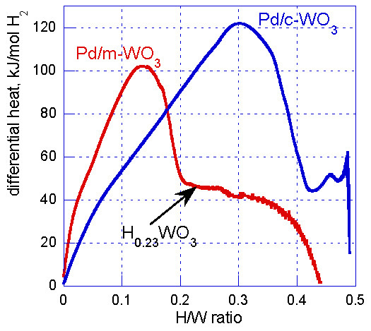 The presence of noble metals greatly facilitates the intercalation of hydrogen species in the host lattices of the transition metal oxides. Although simple exposure of the oxide to gaseous hydrogen is usually sufficient for the bronze to be formed, since the bond energy of the H2 molecule is as high as 440 kJ/mol, it is a slow process without an extra component activating the molecular hydrogen. On the other hand, doping the oxide surface with noble metals such as Pd enables the bronze formation to be completed under a relatively small partial pressure of H2 and at room temperature (RT) rather than at ca. 300 °C required otherwise. The role of the metallic Pd is to adsorb molecular hydrogen dissociatively at low temperatures. Afterward, the atomic hydrogen species spill over from the metallic nanoparticles onto the oxide surface. Eventually, they penetrate the oxide bulk and are accommodated within the crystal lattice. Despite the large bonding energy of molecular hydrogen, the formation of bronze from Pd/WO3 is an exothermic process (cf. Figure 1) [1]. The figure represents the differential heats of sorption for the intercalation of hydrogen into two Pd-doped WO3 polymorphs. Both curves show marked maxima, indicative of a kind of collective phenomena involved in the hydrogen uptake, which are reflected in the rate of heat evolution.