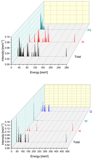 Figure 3 shows the results of the ab initio periodic DFT-based HLD simulations. According to Equation (1), the second moment of any NMD is strongly biased towards the high-energy part of an apVDOS, as every mode of vibration contributes to the total kinetic energy, an amount that is proportional to its vibrational frequency. Thus, the biggest contribution to the hydrogen NMD width and kinetic energy will be from the modes at ca. 260 and 460 meV for hydrogen-terminated beta-palladium hydride and the cubic phase of tungsten oxide terminated with hydrogen in acid centers, respectively. In the case of heavier atomic species, the bulk of the contribution lies in the low-energy part of their respective apVDOSes, below 40 meV in the case of palladium and below 100 meV in the case of oxygen and tungsten. Consequently, the hydrogen NMD width and kinetic energy values will be much more influenced by the local vibrational modes, whereas their counterparts for the heavyweight nuclear species will be dictated more by the lattice modes. The values of the NMD width, KE, and FC for all constituent atomic species in both systems, calculated using Formulas (1)–(3), respectively, are listed in Table 1.