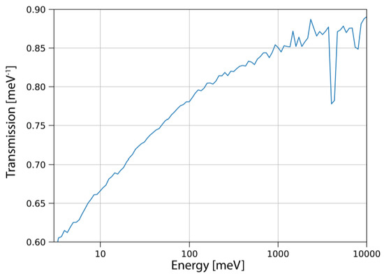 Neutron transmission data are plotted as a function of the incident neutron energy at VESUVIO in Figure 6. The Pd/cWO3 sample transmission, corresponding to the plateau of the transmission curve for incident neutron energy values in the region of 100 eV, has a value of 0.87, in agreement with the initial estimate calculated based on the known sample number density, thickness, composition, and the values of the tabulated total free scattering cross sections for all constituent nuclei (according to the method outlined in Refs. [106,119,120]). This value corresponds to the ratio of single to multiple scattering in the order of 1%, which is suitable for using multiple scattering signal correction procedures based on the Monte Carlo (MC) transport code routinely used for VESUVIO data analysis.