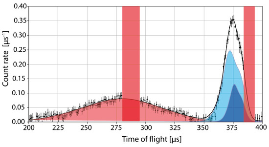 Figure 7 shows the total neutron response of the Pd/cWO3 sample focused in the TOF domain. A good quality fit has been achieved. The TOF region (marked as the red-shaded area in the plot), between 200 and 350 microseconds, represents the total signal due to Compton scattering off all three types of hydrogen species present in the sample.