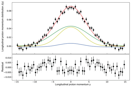 The total hydrogen NCS signal, transformed and focused on the longitudinal momentum domain (using the West-scaling variable [24,25], hereinafter referred to as y), is shown in Figure 8. As described above, our strategy has been to decompose the total signal in three distinct components: (i) the contribution from the momentum distribution of the hydrogen species present in the beta phase of PdH, (ii) the contribution from the hydrogen in OH+ acid centers present on the surface of the cubic phase of WO3, and (iii) the contribution from the hydrogen species inside the HxWO3 bronze. The NMD widths of protons in the first two components were fixed in fitting at values obtained from the DFT simulations, as described in Section 3.1. Moreover, the ratio of relative contributions of the first and third components has been fixed, assuming that it is proportional to the ratio of the metallic phase of palladium to the cubic phase of tungsten oxide, as assumed in preparation, confirmed by XRD. Thus, the only free parameters in the analysis of data shown in Figure 8 are the NMD width of the hydrogen species inside the HxWO3 bronze and the relative contribution of these species, measured in units of the total signal. Such a heavily constrained fitting procedure allows for precise determination of the NMD width and relative contribution of the most elusive hydrogen species, the atomic hydrogen resulting from the spillover process. The fitting results are summarized in Table 2.