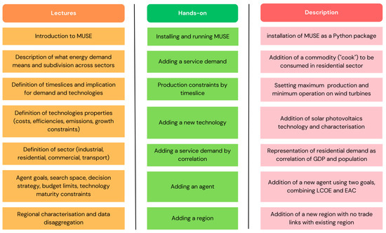 The Open University course for MUSE, after an introduction to the course, included seven lectures, and seven hands-on. The content of each lecture and hands-on session is summarized in Figure 3. The introduction to the course contained a description of the course and notions of energy system modeling, where concepts surrounding limited resource availability and links between fuel combustion and emissions were introduced. In this way, the students were given the basics of technological, societal, and economic pathways (also called scenario narratives) to transition to a low-carbon world.