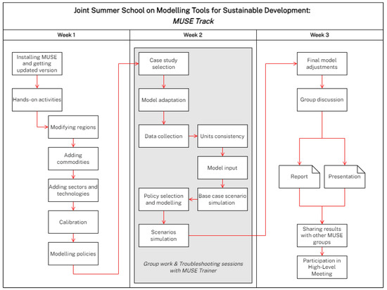 Considering the Summer School duration and learning purpose, students from Group 1 built a MUSE model with only one sector, representing light-duty road passenger transport. The developed model relied on a simplistic representation of the market, as only one agent and one region (i.e., the UK) were modeled. The investor–agent made decisions based on the single objective function of minimizing the LCOE. Nonetheless, the students had the opportunity to discuss the importance of having different agents representing different socio-economic groups; for instance, so as to consider the potential uneven uptake of alternative vehicles given their higher purchase costs. Commodities modeled represented fuels (input) and CO2 emissions (output). Scenarios of transport decarbonization were simulated from 2020 (base year) up to 2050 using a 5-year time step and six evenly distributed timeslices. The workflow of the case study development is represented in Figure 4, framed by the Summer School’s time span.