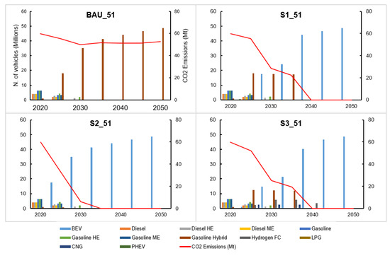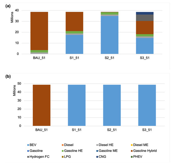 The case study focused on the UK transport sector; more specifically, the fleet development of light-duty vehicles under different demand projections and technological progress until 2050. The selection of UK as the case study was based on, first, the relevance of the UK as a major economy, as it accounted for 1.1% of global greenhouse gas (GHG) emissions in 2020, a share equivalent to approximately 400 million tones of CO2 equivalent [38]; and, second, the availability of open data from national statistics (e.g., [39]). Regarding the transport sector’s relevance for national decarbonization plans [40], 27.0% of the country’s domestic emissions come from transportation, excluding international aviation and shipping [41], of which 55.4% originates from road passenger vehicles (i.e., cars) [42]. Currently, there are more than 32 million vehicles in the UK, which represents 400 billion vehicle-km (v-km) traveled [43] and an approximate consumption of 900 PJ per year [44].