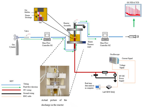 About 9 g (~12 mL) of pure C16 (>99%) from Sigma Aldrich was injected into the reactor, partially filling the glass chamber and filling the discharge gap between the top and bottom electrode. Carrier gas was bubbled into the gap at a rate of 10 SCCM (standard cubic centimeter) through the capillary and controlled using a mass flow controller from Alicat, Tucson, AZ, USA. The temperature of the discharge gap was maintained at 100 °C by heating the bottom plate. A thermocouple was also inserted into the bottom aluminum plate to monitor the temperature. The flow rate of the outlet gas was measured by another mass flow meter and data were logged into its flow controller software. A 50 mL syringe was also used to calculate the volumetric flow rate by recording the time taken to fill the syringe. The syringe was later sampled and analyzed using a Shimadzu gas chromatograph 2014 equipped with a flame ionization detector for detecting hydrocarbons and a thermal conductivity detector for detecting hydrogen. A 27-refinery gas calibration standard was performed to measure the linearity of distinct hydrocarbon gas species and calibrate the instrument to enable molar volume concentration outputs after running a sample.