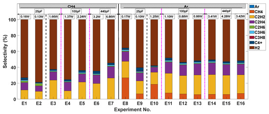 Figure 2 shows the molar selectivity plot for the experiments. Generally, the selectivity toward intermediate hydrocarbons is higher for Ar as a carrier gas compared to methane. Using pure CH4 as a carrier gas favors more hydrogen selectivity. The highest selectivity for H2 using CH4 as a carrier gas is in E2 with 79% selectivity compared to 60% for the Ar case in E9. For experiments with CH4 as the carrier gas, the multiphase interactions are very complex and distinguishing whether a product arises from the methane or liquid phase cannot be determined. However, it can be concluded that the new gas species concentrations are from both liquid and gas phase interactions with plasma. For Ar as a carrier gas, Ar is an inert gas and, while it can interact as a short-lived radical in the plasma, it does not form stable long-lived compounds with other molecules. Hence, all the gas species products with the Ar carrier are from the liquid phase interaction with plasma. It is possible that some of the product gas hydrocarbon species interact with the liquid phase and generate new molecules. Bubbles are about 2 mm in diameter and, at a flow rate of 10 sccm, have a formation time of ~200 ms. The plasma typically pulses at 10 to 50 Hz (100 ms to 20 ms period between pulses). So, the plasma may interact with a bubble a few times before it exits the discharge zone. Based on this, it is not surprising that the argon discharge is ~10% more selective to produce higher hydrocarbon species than hydrogen. In the methane case, the energy is distributed to both the methane gas and the liquid, producing on average lighter-molecular-weight crack products. The lower C2H2 yield in the pure CH4 case with low capacitance and plasma power compared to higher-capacitance and higher-plasma-power cases in pure CH4 is also believed to be due to faster energy dissipation and thermal quenching, which suppresses the production of C2H2, which is thermodynamically favored at higher gas temperatures and longer residence times [50,51]. The selectivity in the Ar case remains constant except for E8 where methane production is higher than average. There is more variation in selectivity with the CH4 case. Although H2 is the focus of this paper, the other products may also be valuable fuels or chemical/plastic precursor commodities and are efficiently produced by this process. Also, liquid products are generated but not measured for all these cases.