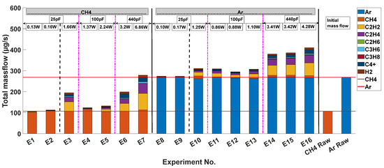 The product mass flow rates (µg/s) of various hydrocarbon species and hydrogen gas produced from measured GC-FID/TCD molar concentrations for various plasma powers and capacitances using pure CH4 with n-C16 (E1–E7) and pure Ar with n-C16 (E8–E16) are also calculated as shown in Figure 3. The mass flow rate is calculated based on both syringe volumetric syringe measurement and mass flow measurement from the mass flow meter and data are validated against each other. Controlled experiments flowing pure CH4 and Ar in C16 are also performed and plotted as raw values. The raw values act as a baseline for validation of the experiment. The mass flow rate of Ar should remain constant irrespective of the presence of plasma as Ar is an inert gas. For CH4, it can be produced or consumed in the reaction. It is shown that generally similar hydrocarbon gas species and hydrogen gas are produced compared to the pure Ar cases for similar given plasma powers and capacitances. Achieving high power with low capacitance is quite difficult as a higher frequency is needed to obtain the power and, most times, the spark discharge can transform to a glow. A spark is preferred as it has a significantly higher plasma-to-liquid multiphase interaction than a glow discharge. Hence, the experiment needs to be carefully controlled to ensure the glow mode is not occurring. For a given plasma power, as the power increases, the product mass flow rate of hydrocarbon species increases for both the pure CH4 and pure Ar cases. The total mass flow of Ar cases is higher than that of CH4 because Ar weighs more than CH4. The mass flow rate of pure CH4 is ~100 (µg/s) while the mass flow rate of pure Ar is ~265 (µg/s). The highest mass flow of H2 is from E7 with the highest power at 12.5 µg/s with 6.86 W. For Ar as the carrier gas, E13 with 440 pF produces the highest H2 at 10 µg/s with 4.28 W. Again, a higher frequency contributes to a higher mass flow of hydrogen with lower capacitance compared to higher capacitance with low frequency. For example, the E3 H2 production rate is 9.2 µg/s with 1.66 W compared to E4 at 2.6 µg/s with 1.37 W. Similarly for Ar, the E10 H2 production rate is 5.1 µg/s compared to E11 with 2.6 µg/s.