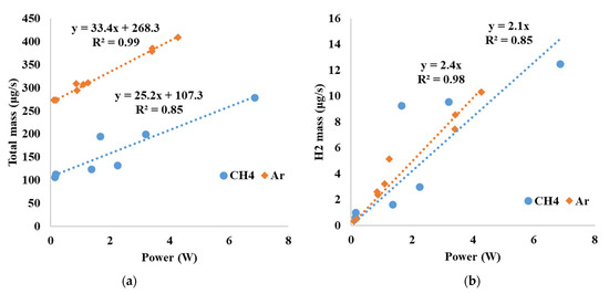 Product mass flow dependence on plasma power. (a) Total mass flow of products changes with plasma power; (b) hydrogen mass flow changes with plasma power. The relationship can be interpreted as a first-order approximation seen as the dotted lines, where as power increases, both the total mass and H2 mass increase approximately linearly. The goodness of fit is also indicated by the R2 value.