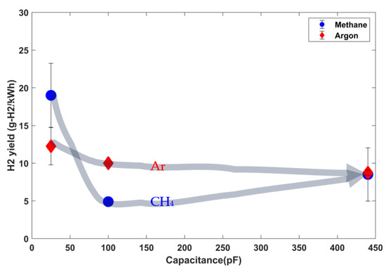 Hydrogen yield (g-H2/kWh) is the most important metric to determine the efficiency of the system at producing hydrogen. It is defined as the amount of H2 produced per kWh of electrical energy consumed. Capacitance is the main independent variable in the experiment. Hydrogen yield and capacitance (pF) for each experiment are plotted in Figure 5 with both CH4 and Ar as carrier gases. Three power levels (0.1 W, 1 W, and 4 W) are also compared as capacitance changes. Generally, higher hydrogen yields are obtained with a lower capacitance of 25 pF by using CH4 as the carrier gas. However, a lower capacitance is also susceptible to variations in hydrogen yield. A low capacitance with CH4 as a carrier gas provides a higher H2 yield. This could be attributed to the fact that CH4 also takes part in dissociation reactions and contributes to H2 yields, while Ar is an inert gas. As capacitance increases, the hydrogen yield decreases rapidly. For Ar, the H2 yield is consistent for all different capacitance and power levels. For CH4, the relation rather has a minimum at 100 pF and then increases at 440 pF. For 100 pF, it is even less than that of Ar. One possible explanation is, as a lower capacitance results in a lower energy per pulse, 25 pF mostly cracks CH4 molecules into H2 and not much energy is spent reforming liquids. At a capacitance of 100 pF with a higher pulsing energy, both CH4 molecules and liquid hexadecane molecules are broken down, resulting in higher H2 yield. When the capacitance is further increased to 440 pF, pulsing energy may be too high and results in significant gas heating and efficiency loss. The non-equilibrium gas phase mechanism is more efficient at low Ttrans and high Tvib, while equilibrium thermal mechanisms are more efficient at very high Ttrans. At intermediate conditions, neither equilibrium nor non-equilibrium processes are efficient.
