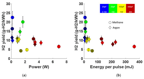 Generally, the hydrogen yield decreases as the power is increased and is mainly sensitive at lower powers, as shown in Figure 6a. With power >1 W, the yield flattens out. The best results obtained are the pure CH4 case, achieving >22 g-H2/kWh at ~0.1 W. The best results for the Ar case are achieving >14 g-H2/kWh at similar power. The results show that for efficient hydrogen production in a batch system using a pulsed non-thermal plasma, a plasma power less than 0.1 W is preferred. However, the process scale-up for industrial applications will be a challenge due to the extremely low power density of the system. To overcome that, using a continuous-flow system to convert natural gas and liquid fuel would allow much higher plasma powers and still avoid hot gas temperature in the plasma zone because of effective cooling. Systems like such are being developed at the pilot stage.