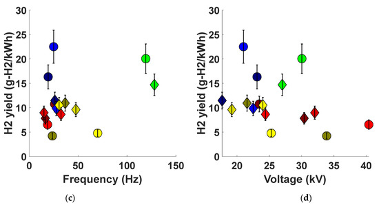 The effect of power, energy per pulse, frequency, and voltage on H2 yield (g-H2/kWh). (a) The relation between power and H2 yield. (b) The relation between energy per pulse and H2 yield. (c) The relation between frequency and H2 yield. (d) The relation between voltage and H2 yield. The horizontal error bars are less than the marker size and hence are not reported here. An increase in power with the same capacitance is represented by a change in color from dark to light.