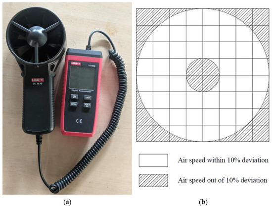 Wind tunnel speed testing: (a) calibrated anemometer for measurement; (b) axial velocity profile of the wind tunnel.