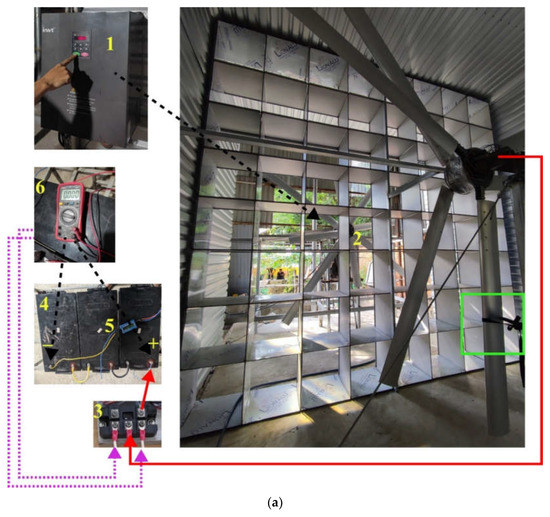 The test model was set up as follows (Figure 3a): the wind tunnel fan was controlled by the inverter (1). The wind turbine rotated and generated an alternating current, which was then rectified by a diode bridge (3). Next, one output was connected to the negative terminal of the battery system (4) (including three 12 V batteries). The anode was left open. The multimeter (6) was pinned to the front of the diode bridge (3) to measure the frequency of the alternating current from the turbine (the pink dashed line), and to measure and check the output voltage.