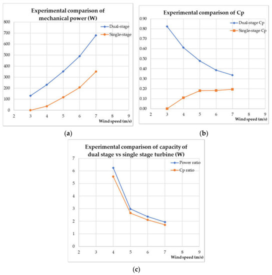 Performance comparison charts between dual and single-stage wind turbines: (a) experimental comparison of mechanical power; (b) experimental comparison of Cp; (c) experimental comparison of power ratio and Cp ratio.