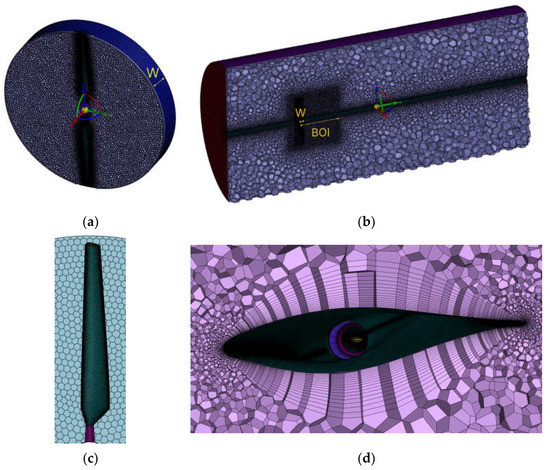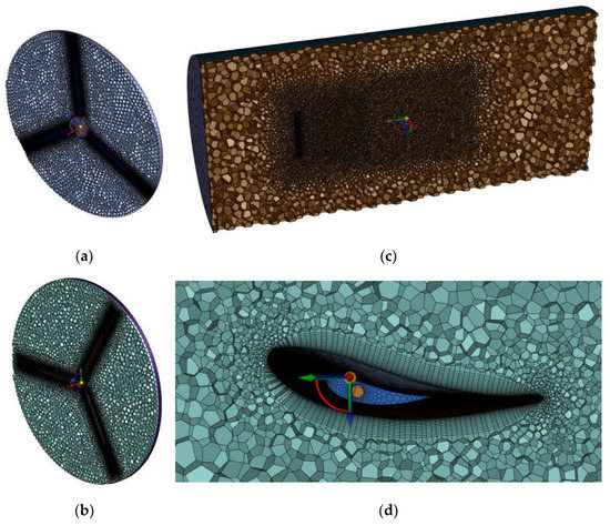 The mesh was built mostly from polyhedral elements (Figure 5), which also reduced the computational cost compared to a tetrahedral mesh. Approximately 16 boundary layers (Figure 5d) were used in the meshing process to ensure the correct depiction of the lift and aerodynamic drag of the blades and to save on computational costs.