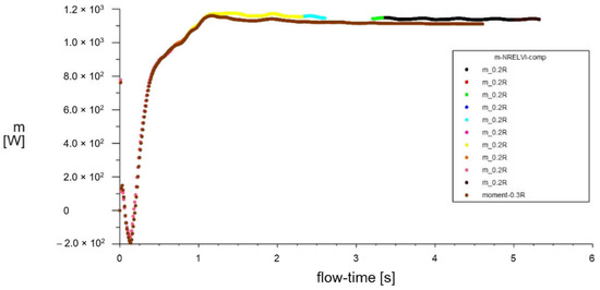 In terms of numerical computation, the conclusion was made as in Section 4.1. In addition, when a transient simulation was conducted, the URANS (unsteady Reynolds−averaged Navier–Stokes), MRF−sliding mesh model with a k omega SST turbulence model for an NREL VI turbine was used with the same parameters as in the cases of 0.06Rf (m_0.2R on Figure 7) and 0.09Rf (m_0.3R on Figure 7).The second spatial discretization scheme, the PISO scheme for Pressure−Velocity Coupling (widely used and accuracy proven [17,18]) are also used. The torque results on the turbine shaft are 1138 N·m and 1141 N·m, respectively. These results are 2.9% and 3.2% larger, respectively, than the experimental results. This is an acceptable level of error.