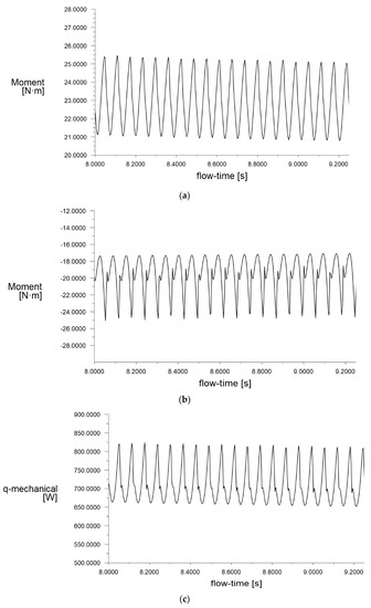 Another result that can be observed is that the turbine power changes periodically (shown in Figure 11). At the convergence value of the simulation, the turbine power tends to change continuously from a minimum value to a maximum value. It can be understood that each time the front rotor blades coincide with the rear rotor blades on a plane, there are significant decreases in thrust and torque for the rear stage and significant increases in thrust and torque for the front stage.