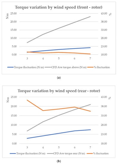 Torque variations in front and rear rotors by wind speed: (a) shaft torque variation of the front rotor with wind tunnel wind speed; (b) shaft torque variation of the front rotor with wind tunnel wind speed.