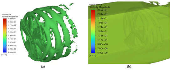 Typical wake vortex structures of the novel dual−stage turbine at a wind speed of 7 m/s: (a) isosurface: vorticity = 12 s−1 for case A; (b) isosurface: vorticity = 16 s−1 for case B.