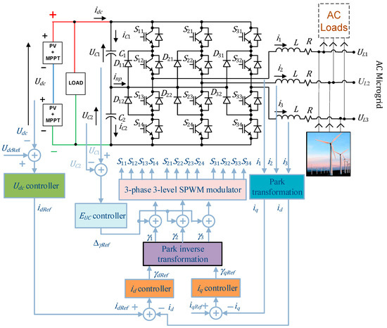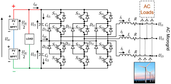 The multilevel NPC converter is connected to a DC grid, with loads and DC renewable sources, while interfacing the AC microgrid, as depicted in Figure 1.