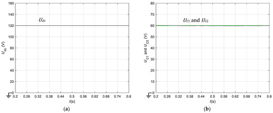 DC voltage simulation results in steady state using the averaged controller: (a) voltage; (b) and voltages.