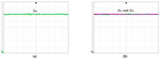 Experimental results in steady state using the separated dynamics backstepping controller: (a) DC voltage, vertical: 20 V/div; (b) Capacitor voltages, and , vertical: 10 V/div. Horizontal: 50 ms/div.