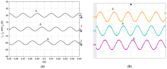 Results of AC current, , , and , in steady state with the separated dynamics backstepping controller: (a) Simulation; (b) Experimental results. Vertical: 4 A/div. Horizontal: 10 ms/div.